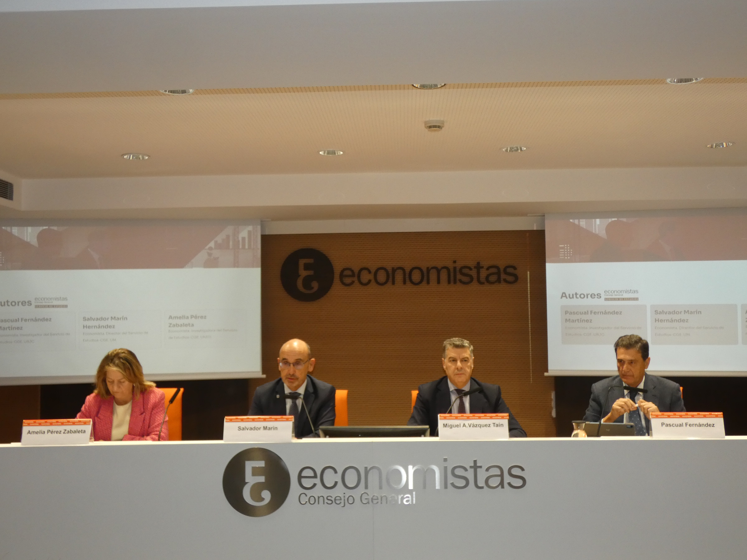 En el acto han participado Miguel Ángel Vázquez Taín, presidente del Consejo General de Economistas de España (CGE), y los autores del estudio: Pascual Fernández Martínez, economista e investigador del Servicio de Estudios-CGE, URJC; Salvador Marín Hernández, economista y director del Servicio de Estudios-CGE, UM; y Amelia Pérez Zabaleta, economista, vicepresidenta del CGE e investigadora del Servicio de Estudios-CGE, UNED. Esta última ha moderado el debate que se ha generado al final de la jornada.