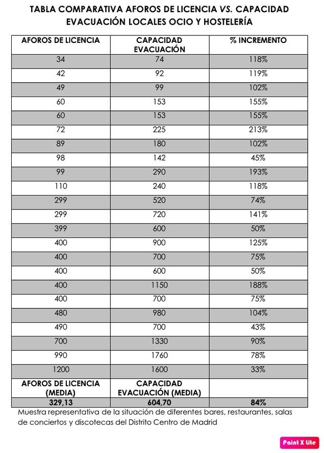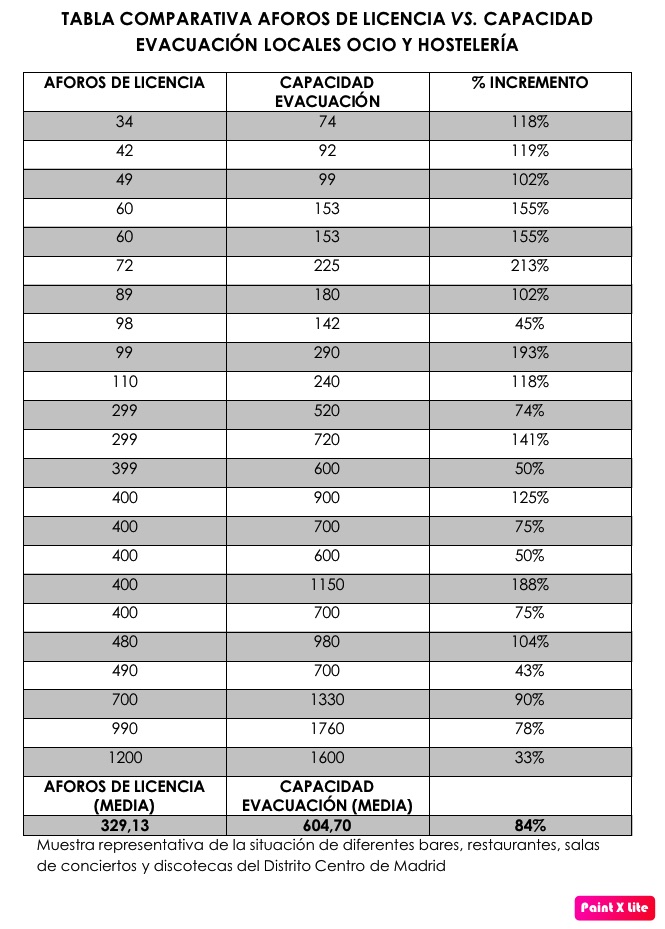 A partir de una muestra representativa de locales de ocio y hostelería de Madrid se ha elaborado una tabla que constata la profunda discrepancia existente entre los aforos de licencia y el aforo de seguridad, entendido como la capacidad real de evacuación de los establecimientos.