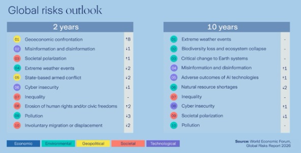 Aunque la confrontación geoeconómica, los conflictos armados entre Estados, los fenómenos meteorológicos extremos, la polarización social, la desinformación y la información errónea fueron señalados por los encuestados como los cinco principales riesgos inmediatos en 2026, la desinformación y la polarización social ascendieron al segundo y tercer puesto, respectivamente, en las previsiones a dos años.