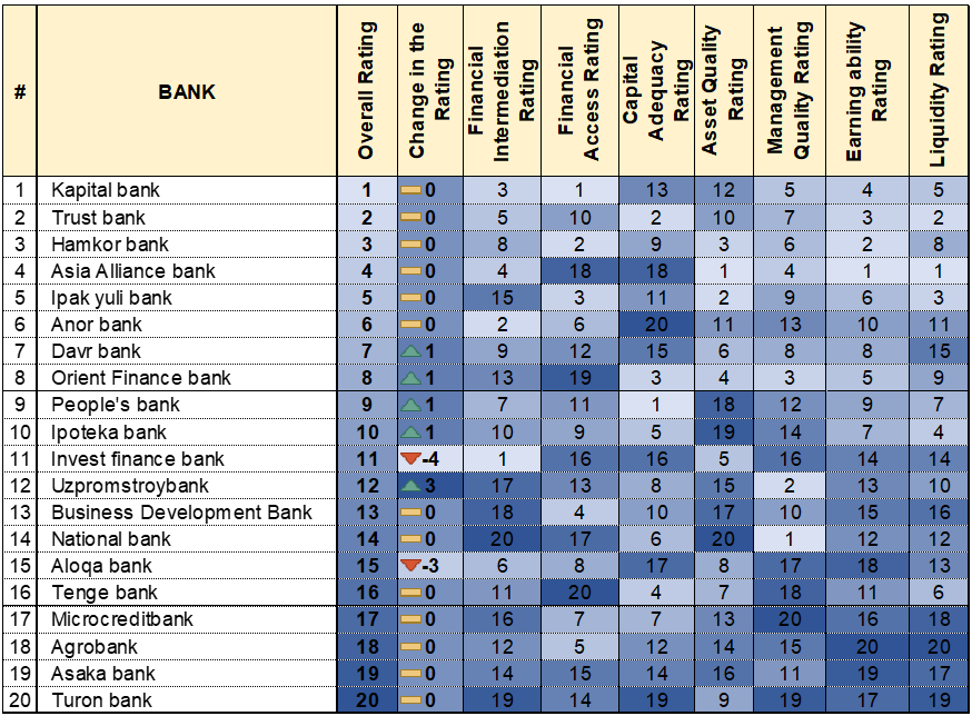 En la intermediación financiera, Tenge Bank e Ipak Yuli Bank mostraron una disminución en la eficiencia de captación y asignación de recursos, perdiendo cuatro y tres posiciones, respectivamente. National Bank, Asia Alliance Bank, Anor Bank, BDB y Mikrokreditbank también descendieron una posición en esta categoría. En términos de inclusión financiera, se registró una caída de una posición para Orient Finance Bank, Xalq Bank, Agrobank, BDB e Ipoteka Bank. En cuanto a la calidad de los activos, seis grandes bancos registraron un retroceso. Agrobank perdió tres posiciones, mientras que National Bank, Trast Bank, Anor Bank, Aloqa Bank y Asaka Bank descendieron dos posiciones cada uno. A pesar de la dinámica general positiva de las ganancias en el sector, dos bancos registraron una disminución de la rentabilidad: National Bank y Anor Bank, que cayeron dos y una posición, respectivamente. En eficiencia de gestión, se observaron posiciones más débiles en Mikrokreditbank y Anor Bank, ambos con una caída de dos posiciones. En términos de liquidez, casi un tercio de todos los grandes bancos del país perdió posiciones, siendo Davr Bank el que registró el mayor descenso, con una caída de seis posiciones, mientras que Agrobank cerró el ranking, descendiendo hasta la última posición en este indicador.