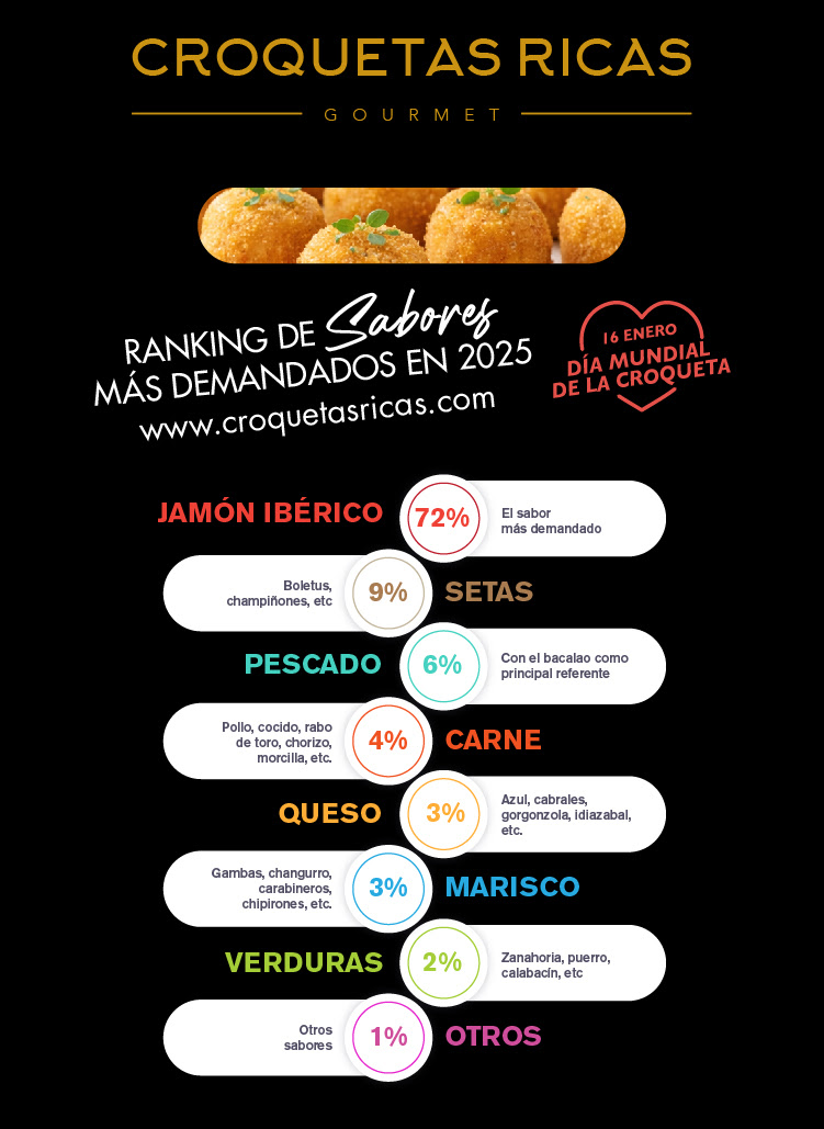 Este es el ranking final de consumo de croquetas en España durante 2025 donde el jamón ibérico es el rey con un 72% de consumo:
