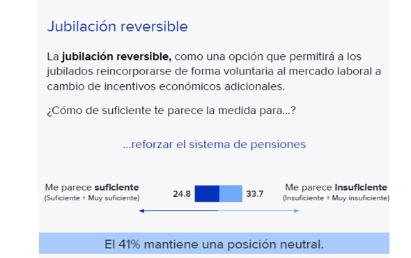 La segunda medida que concentra una mayor percepción de insuficiencia para cumplir su objetivo, por detrás de la subida del SMI, es la propuesta de la jubilación reversible, que permitiría a los jubilados reincorporarse de forma voluntaria al mercado laboral a cambio de incentivos económicos adicionales. En concreto, el 34% de los trabajadores considera que esta medida es insuficiente para reforzar el sistema de pensiones y el 41% adopta una posición neutral, lo que indica que una parte muy relevante de la población tiene reservas sobre su eficacia. El porcentaje de quienes la valoran como suficiente es del 25%.