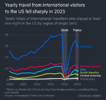 Los datos más recientes introducen, sin embargo, un contraste llamativo con esa narrativa histórica. En el primer año del segundo mandato de Donald Trump, los viajes internacionales hacia Estados Unidos (excluyendo México y Canadá) registran una caída significativa. El movimiento sugiere que algo más profundo que el ciclo económico podría estar en juego.