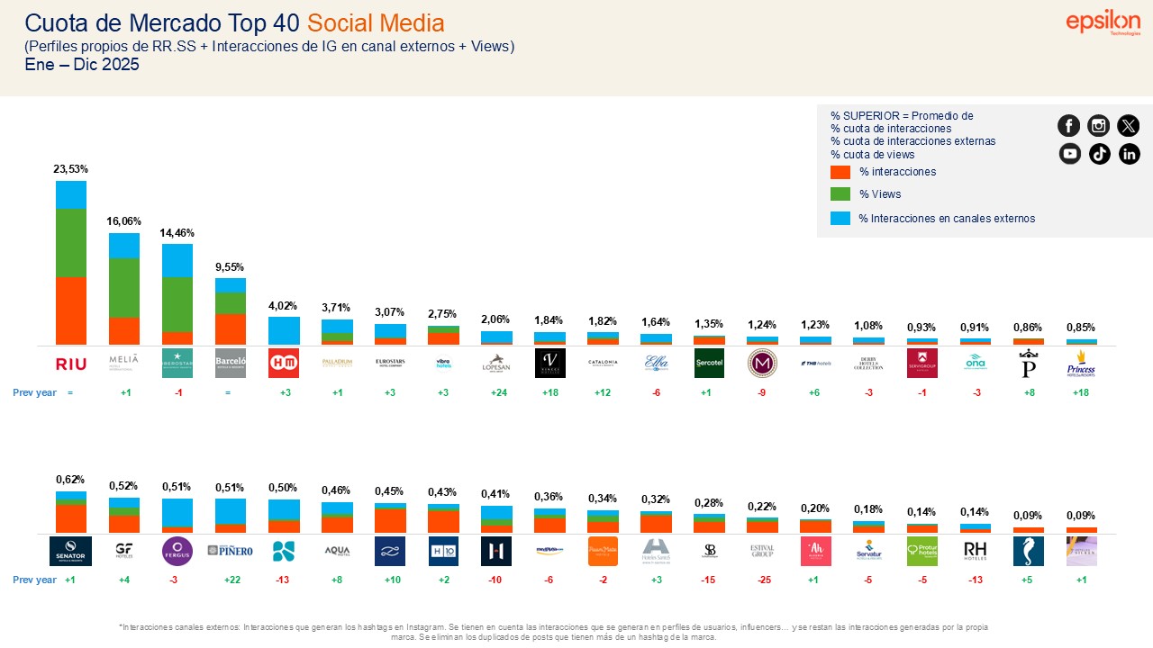 La consultora estratégica de marketing digital Epsilon Technologies ha presentado el informe ‘Panel TOP Cadenas Hoteleras en cuota de atención social (SAI) España 2025’, que analiza la atención social de las principales cadenas hoteleras en España entre enero y diciembre 2025 y revela cómo están evolucionando las estrategias de conexión con el consumidor en redes sociales. El análisis se centra en las 40 principales cadenas hoteleras españolas por volumen de facturación, según el ranking Hosteltur 2025 y analiza exclusivamente sus perfiles corporativos de marca en redes sociales, sin incluir perfiles de hoteles individuales o locales gestionados por las cadenas; tampoco se contemplan grupos internacionales que no formen parte de dicho ranking. El análisis se realiza mediante la tecnología de Big Data Epsilon ICARUS Analytics.