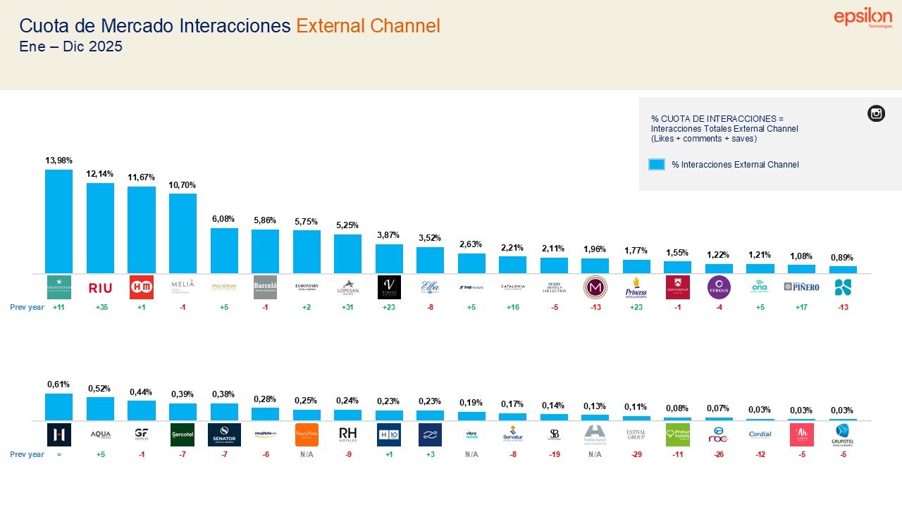 El análisis muestra una fuerte concentración competitiva: Riu, Meliá, Iberostar y Barceló capturan el 60% de la cuota de atención social del sector, liderando también métricas clave como visualizaciones, interacciones y conversación generada en canales propios y externos.