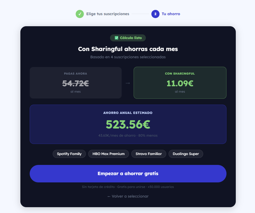 En este escenario, la calculadora de Sharingful introduce un elemento clave: la capacidad de medir. La herramienta permite al usuario seleccionar las suscripciones que tiene activas y obtener, en segundos, una estimación clara de: