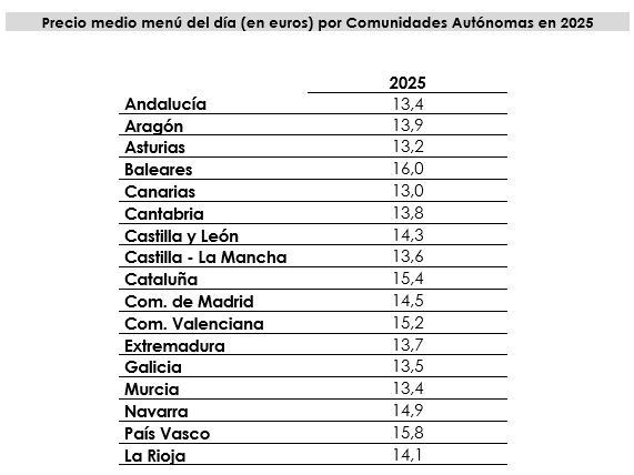 • En 2025, el precio medio del menú del día se situó en 14,2 euros en España, una cifra que se mantiene como referencia en 2026 pese al aumento de costes que afronta el sector