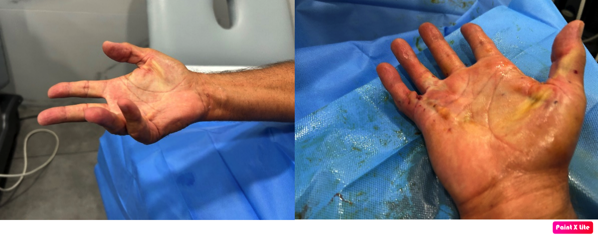 Mano izquierda, antes y después. Se aprecian los puntitos de perforación de la aguja para cortar la aponeurosis de la palma de la mano bajo control de ecografía.