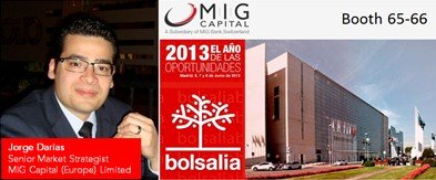MIG Capital (Europe) Limited anunció hoy que su Chief Executive Officer, Federico Cirulli, y el Estratega de Mercados Financieros, Jorge Darias, se reunirán con socios, clientes y periodistas en el Fórum Bolsalia 2013 que se celebra entre los días 6 y 8 de junio en Madrid, España. El evento, considerado una de las mayores exposiciones en temas financieros de España, representará una gran oportunidad para que inversores regionales conozcan los servicios de MIG Capital y a su gran equipo. Asimismo MIG Capital ofrecerá a quienes visiten su stand, la posibilidad de ganar un iPad participando en el juego de trading de Forex llamado “Adivine y Gane”.