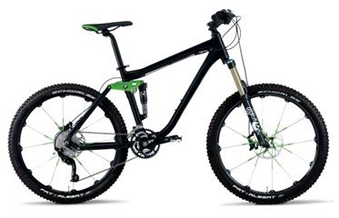 bicicleta está pintada en negro mate con detalles en verde brillante en el sillín fi’zi:k, en las llantas Crank Brothers y en el basculante.