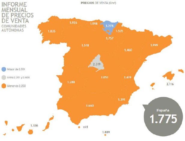 Respecto al año pasado, Salamanca (8,17%), Palencia (0,64%) y Melilla (0,13%) son las únicas provincias que suben, mientras que los descensos los lideran Jaén (-26,01%), Cuenca (-22,43%) y Ourense (-20,62%). En la clasificación de las provincias por precio, en julio de 2013 la primera posición es para Guipúzcoa, con 3.926 euros por metro cuadrado. Le siguen Vizcaya (3.214 €/m²) y Álava (2.336 €/m²). En el lado opuesto se encuentra Cuenca, que cierra la clasificación con 736 euros por metro cuadrado. Otras provincias económicas son Ciudad Real (848 €/m²) y Toledo (963 €/m²).