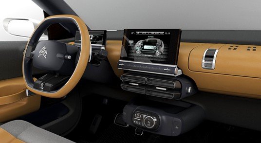 El primer objetivo al diseñar el interior del Citroën Cactus ha sido liberar espacio para el conductor y sus pasajeros, despejando el habitáculo para ofrecerles más holgura y un mayor confort. El salpicadero delgado y flotante permite liberar totalmente el suelo mientras que el pasajero delantero dispone, en la parte superior, de un amplio espacio, de fácil acceso, para dejar objetos. Este resultado se ha podido conseguir adoptando una interfaz 100% digital y optimizando la organización del puesto de conducción. Así, se ha sustituido el cuadro de instrumentos por una pantalla de 7 pulgadas, suprimiendo los botones en favor de una pantalla táctil de 8 pulgadas que permite acceder a todas las funciones (climatización, audio, navegación, servicios conectados y ayudas a la conducción). Además, se ha ubicado el airbag del pasajero en el techo y eliminado la palanca de cambios tradicional en favor de un botón de selección en la parte baja del salpicadero y de levas en el volante.