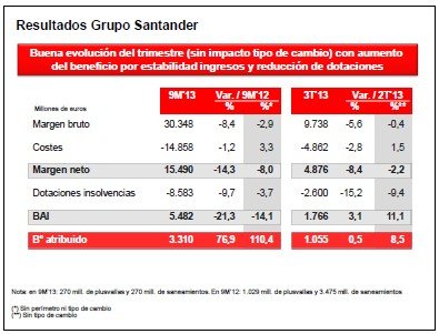 Banco Santander ha cerrado el tercer trimestre de 2013 con un beneficio atribuido de 3.310 millones de euros, lo que supone un aumento del 77% con respecto al mismo período de 2012. El presidente de Banco Santander, Emilio Botín, ha señalado que “tras varios años de fuertes saneamientos y fortalecimiento del capital, Banco Santander está preparado