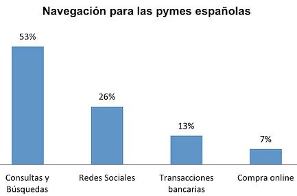 Según datos de este estudio, a la hora de navegar, las búsquedas y consultas se sitúan en primer lugar para las pymes españolas (un 53% navega sobre todo para realizar búsquedas frente al 26% que lo hace para gestionar las redes sociales de su negocio). Por detrás se sitúan las transacciones bancarias (13%) y las compras online (7%).