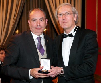| A la izquierda, nuestro Editor-Director José Luis Barceló recogiendo la Medalla de Oro del Foro Europa 2001 de la mano de su Presidente, José Luis Salaverría. |