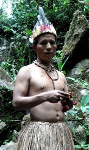 Desconcertado. Esa es la sensación que embargó a mi asustado corazón cuando, en compañía del aspirante a Chamán Claudio Grefa, a quién muestro en la foto, pisé por primera vez un bosque de selva primaria. Un desconcierto que pude superar varios días después, gracias a los efectos alucinógenos que produjo en mi mente la primera ingesta de la Ayahuasca. Desconcertado cuando, al penetrar en la espesura, observo a Claudio colocar sus manos en posición de rezó... pidiendo permiso o perdón por entrar. Desconcertado quedé también cuando me mostró la cabeza de una gran anaconda esculpida en piedra y cómo rezaba ante ella. Desconcertado cuando pidió permiso a un gran árbol antes de descolgar varias "colas de mono" cuyas sabrosas semillas después comimos. Desconcertado por pisar despacio y no hacer ruido al caminar. ¿Por qué desconcertado? Simplemente por ignorancia, por no saber cómo actuar y qué podía o no tocar. ¿A quién y por qué pedir permiso por bañarme en el río?... y "hallé la respuesta bebiendo, el Ayahuasca en el interior del Templo, que la mamá de Claudio me entregó".