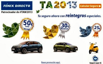 Fénix Directo es patrocinador gold de los Tweets Awards durante esta 3ª edición. Por este motivo, la compañía quiere ofrecer una promoción especial dirigida a sus clientes que permanecerá activa hasta el próximo lunes 14 de octubre. La aseguradora ofrece reintegros de hasta 50€ al contratar una nueva póliza y para participar, basta con enviar un tweet que contenga el hashtag #TAW2013 y mencionar a @Fenix_Directo.