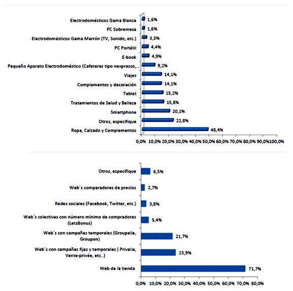 Por otro lado, hay que señalar la importancia adquirida por las webs con campañas fijas o temporales (como por ejemplo Privalia, Groupon, etc.), las cuales agrupan más de un 45% de declaraciones de compra. En este sentido, los desarrollos y evolución de las empresas de distintos sectores en materia online están teniendo sus frutos, atrayendo a clientes online que hace años no hubieran utilizado este canal. Las conclusiones de este estudio informativo se han obtenido a partir una encuesta online elaborada por la empresa Investmarket, tomando como referencia a un conjunto de la población española mayor de 18 años, e incluyendo una muestra de 500 encuestas, siendo el margen de error del +-4,47%.