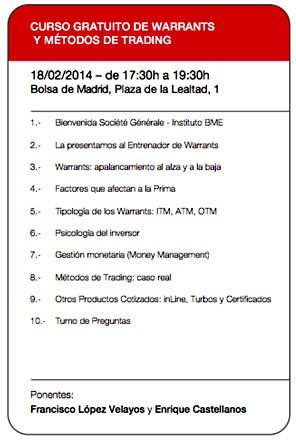 Société Générale realiza cursos por diferentes provincias españolas durante el año. Los inversores interesados en asistir pueden inscribirse en la página web de Société Générale es.warrants.com o en el teléfono gratuito 900 20 40 60. Société Générale es líder en el mercado de warrants con el 53,6% de la cuota de mercado y el mayor emisor de ETF en España con X productos cotizando en la Bolsa de Madrid. (BMEX, febrero 2013)