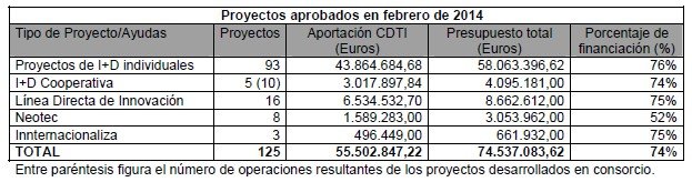 Dieciséis de los proyectos aprobados pertenecen a la ‘Línea Directa de Innovación’. Por lo que respecta al resto de proyectos, 93 son proyectos individuales de I+D; 5 se desarrollarán mediante consorcios empresariales en los que participan 10 empresas; 8 son proyectos ‘Neotec’, programa que tiene como objetivo el apoyo a la creación y consolidación de nuevas empresas de base tecnológica en España, y 3 pertenecen al programa ‘Internacionaliza’ que potencia la explotación internacional de los resultados de las actividades de I+D realizadas por las pequeñas y medianas empresas españolas.