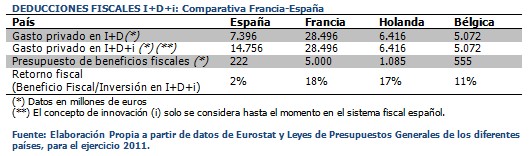 En España, tras diferentes modificaciones de la normativa fiscal, el gasto en actividades catalogadas como de I+D+i es deducible en el impuesto de sociedades entre un 12% y un 42%, en función de la naturaleza de las mismas. En comparación con los países del entorno europeo, España dispone de una de las normativas fiscales más favorables a la innovación, y más aún con la reciente aprobación de la Ley de Emprendedores, que amplía su límite máximo de aplicación con la incorporación del denominado sistema cash back. Así por ejemplo, frente al tipo máximo del 42% de deducción, el porcentaje llega únicamente al 30% en Francia, 37% en Reino Unido, o directamente no existe deducción fiscal aplicable, como en Alemania o Finlandia, países con un gasto en I+D empresarial históricamente relevante.