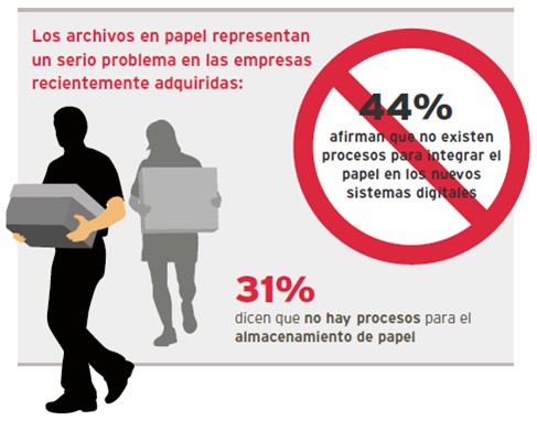 Uno de tres afirma que no hay políticas para integrar archivos o proteger los datos de los clientes (frente a un 19% de los empleados de la empresa adquiriente). Los archivos en papel son los que más sufren: un 44% de las empresas recientemente adquiridas afirma que no existen procesos para integrar el papel en los nuevos sistemas digitales, y un 31% dice lo mismo sobre el almacenamiento de papel.