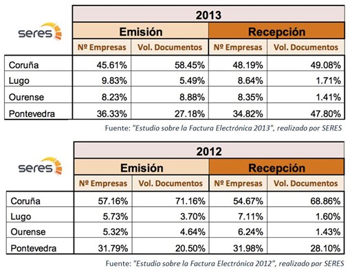 El uso de la factura electrónica en Galicia es una tendencia en alza según el “Estudio sobre la situación de la factura electrónica en España 2013”, realizado por SERES, que analiza el intercambio de facturas electrónicas entre empresas. De acuerdo con estos resultados, en la comparativa con el resto de las comunidades autónomas, Galicia se coloca en la séptima posición en cuanto al número de facturas emitidas y en la quinta en el de recibidas. Los resultados son sensibles a la situación económica: muchas empresas han desaparecido y otras han empezado a usar la factura electrónica para reducir costes y mejorar la gestión. Aunque A Coruña continúa ocupando el primer puesto, el estudio demuestra que Pontevedra, Lugo y Ourense acortan distancias. Lugo destaca por el incremento en volumen y recepción de documentos emitidos respecto al año 2012.