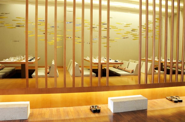 Una vez dentro, a la izquierda, encontramos tres mesas típicas japonesas encerradas en una especie de jaulas de madera, adaptadas a la comodidad occidental, con un foso bajo la mesa para no tener las piernas dobladas mientras comemos; a la derecha, una gran bancada de tela en tonos beis con mesas lacadas en negro; y en el centro de la sala, tres mesas enjauladas con sofás y capacidad para 6-8 personas. Al fondo del restaurante cuenta con un reservado de hasta 20 personas con vistas a un jardín zen.