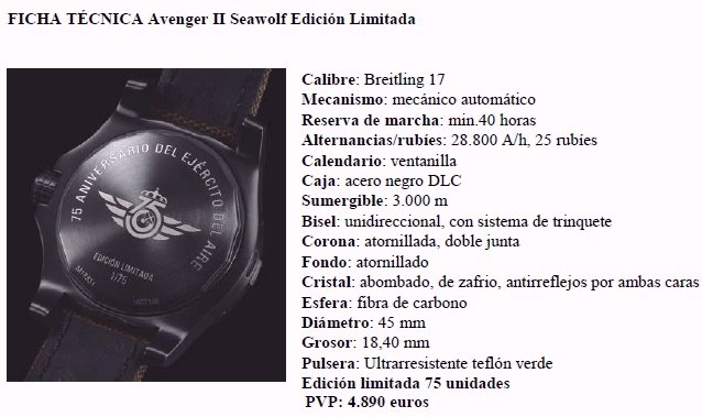 En conmemoración de estos 75 años, Breitling ha creado una edición limitada de 75 unidades del nuevo Avenger II Seawolf Edición Limitada, que expresa en su ADN el espíritu de la aeronáutica propia del Ejército del Aire, del que Breitling es proveedor oficial. Como homenaje, Breitling ha querido personalizar el fondo de este reloj con el escudo especial del “75 Aniversario del Ejército del Aire” y su inscripción.