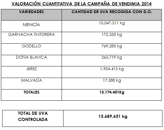 La vendimia en el Bierzo llega a su fin con una producción de 15.689.631 kg de uva recogida, de los cuales un 83,97% (13.174.451 kg) se han destinado para la elaboración de vinos con Denominación de Origen Bierzo. La producción de uva controlada que ha entrado en nuestras bodegas ha sido un 1,3% mayor respecto a la cosecha 2013 y, tomando como referencia las cinco últimas cosechas, es un 3,4% inferior a la media.
