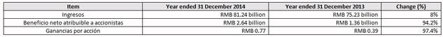 Se prevé que los ingresos de todo el año para ser 11.259 millones de euros, un 8% más que en 2013. El margen bruto mejoró durante 2014, como resultado ZTE la continua optimización de sus operaciones de negocio para alcanzar una mayor rentabilidad. Los gastos financieros de la compañía disminuyeron través de la gestión efectiva de los costes, y la revelación de cambios de divisas. ZTE registró un crecimiento en su negocio de sistemas 4G TD-LTE y FDD-LTE en China, así como sus operaciones de smartphones 3G y 4G a nivel internacional. Más información estará disponible en los resultados de convocatoria anual de ZTE el 25 de marzo de 2015. Tabla 1: Resultados financieros preliminares para el 31 de diciembre del 2014 (sin auditar, en base a las normas de contabilidad de la República Popular de China) en yuanes.