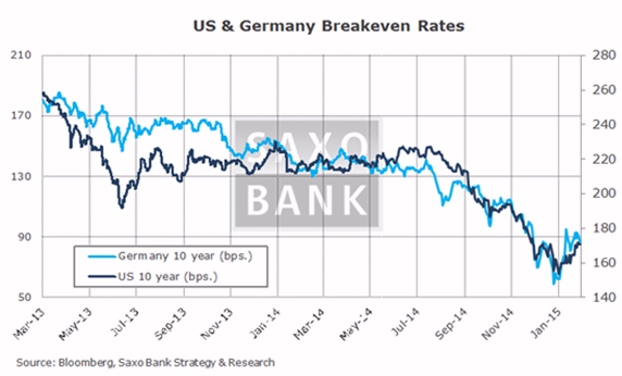 Los indicadores de estrés están indicando claramente que vuelve a aumentar el riesgo, salvo en contadas excepciones, pero el principal gráfico de la semana es este “impresionante” gráfico que indica la sorpresa del Índice de Sorpresas Económicas de Citigroup sobre Europa y EE.UU.: como se esperaba, Europa se ha estabilizado incluso antes de las medidas de expansión cuantitativa del Banco Central Europeo, lo cual resulta irónico. En cualquier caso, se trata de un ejemplo evidente de cómo los políticos vuelven a perder la ocasión de hacer lo que deberían hacer como prioridad uno: ¡Nada! Están llegando más pruebas por parte del sector minorista en Europa: un tweet de esta mañana: (@RobertAlanWard) Otro factor que ha agitado al consenso ha sido la expectativa de inflación, que se ha disparado… ¡justo cuando más se oía hablar sobre la deflación!