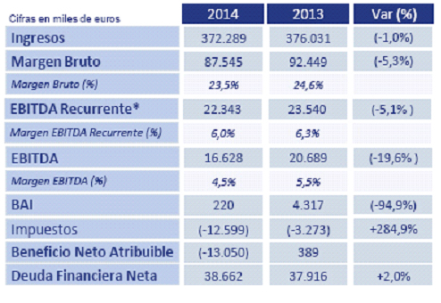El resultado bruto de explotación (EBITDA) cayó un 19,6 %, hasta los 16,6 millones, afectado por las medidas extraordinarias acometidas para finalizar contratos relevantes en Latinoamérica y por los costes de 5,7 millones incurridos como parte de la reestructuración del grupo en España.