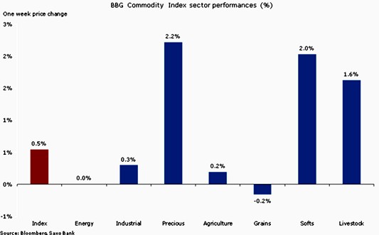 Un dólar más débil y la caída de los rendimientos de los bonos dieron cierto soporte a los metales preciosos, con la primera semana positiva de tres semanas para el oro y la plata. Las materias primas básicas fueron el sector que presentó mejores rendimientos, con el café Arabica y el algodón al alza porque el dólar desencadenó coberturas cortas.