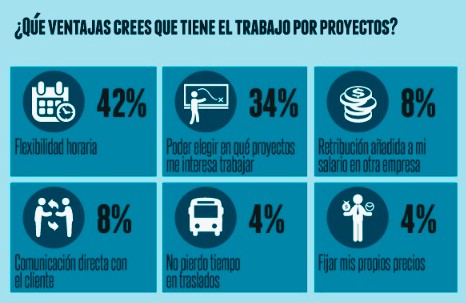 Según este estudio, un 79% de los encuestados tienen previsto o se plantean trabajar por proyectos (modalidad freelance). Hay que sumarle un 8% que asegura que ya lo ha hecho en anteriores ocasiones y que repetiría. En el lado contrario, estarían los que aseguran que no lo harían, un 11%. Así como el 2% que habiendo experimentado el trabajo por cuenta propia, no repetirían.