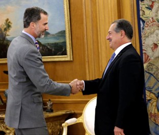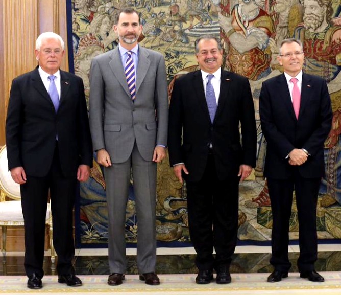 El día 21 de mayo Su Majestad el Rey Felipe VI ha recibido en audiencia privada al Presidente, Chairman y Chief Executive Officer (CEO) de The Dow Chemical Company, Andrew N. Liveris, durante su visita de dos días a España. El CEO de Dow ha estado acompañado del Vicepresidente Ejecutivo y Presidente de Dow Europa, Oriente Medio, África e India de The Dow Chemical Company, Heinz Haller y del Presidente de Dow para España y Portugal, Anton Valero. Andrew Liveris ha visitado la sede de Dow Chemical Ibérica en Madrid y ha tenido la oportunidad de compartir una jornada con los empleados y recibir de primera mano información actualizada sobre el desempeño financiero de la empresa, últimos proyectos y desarrollo de los negocios con clientes. Tras visitar la sede de Dow en Madrid, se ha reunido con Su Majestad el Rey Felipe VI. Liveris ha expresado su satisfacción por la mejora de la situación económica de España y de la evolución de Dow en el país, ha agradecido el apoyo del Gobierno de España a empresas como Dow y ha manifestado al Rey la necesidad de seguir apostando por políticas industriales competitivas, que refuercen el peso de la industria en el PIB nacional. El CEO también ha enfatizado la necesidad de que España avance en materia de competitividad de las tarifas energéticas para poder estar en igualdad de condiciones con otros países a la hora de atraer nuevas inversiones.