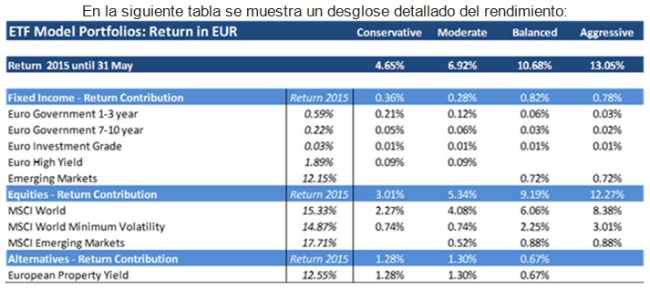 Vamos a actualizar nuestras carteras de ETF con retornos en los primeros 5 meses de 2015 así como presentar la composición de la cartera para los próximos meses. Las 4 carteras de ETF están compuestas por carteras multiactvo globales con un inversor europeo en mente. Para reducir la exposición a las divisas, nos hemos concentrado en la renta fija con exposición a activos denominados en euros, excepto para el mercado de bonos de mercados emergentes, que está basados en dólares. La exposición en renta variable se invierte en mercados globales desarrollados (MSCI World y MSCI World Minimum Volatility) y mercados emergentes (MSCI EM), replicando un universo de MSCI de todos los países. Las cuatro carteras de ETFs se han comportado bastante bien hasta ahora en 2015. Las acciones están dando las mayores ganancias pero los bonos emergentes también están ayudando.