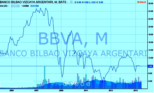 Lo Que Hemos Visto del BBVA Este AñoMientras BBVA tuvo un tiempo relativamente rugosa hacia el final del año 2014, no ha sido el caso este año. De hecho, este año, hemos visto un sólido crecimiento lento y constante de las acciones. A medida que la economía europea siguió mejorando, hemos visto mejoras en los valores de los bancos de la región, así; y como uno de los mayores bancos de la zona euro, BBVA definitivamente ha visto los frutos del crecimiento. Hacia el final de enero, BBVA se redujo a 8,44 dólares por acción. Sin embargo, después de un fuerte ritmo de crecimiento a lo largo de los últimos 6 meses, la acción llegó a 10,65 dólares por acción el 22 de junio. Lamentablemente, sin embargo, no parece como si el crecimiento es probable que continúe.