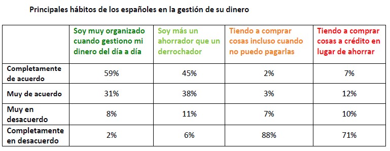 En relación a los hábitos que tienen los españoles para gestionar su dinero, la mayoría no suele comprar cosas cuando no puede pagarlas, ni las tiende a comprar a crédito”. De hecho, casi el 60% se considera muy organizado cuando gestiona su dinero del día a día.