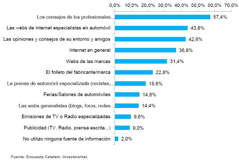 Respecto a la pregunta de cuáles serían las fuentes de información más valoradas a la hora de comprar un coche nuevo, el 57,4% considera que los consejos de los profesionales y vendedores son la fuente de información más valiosa. En segundo lugar, las webs de internet especializadas (43,8%); y en tercer lugar, las opiniones y consejos de su entorno y amigos (42,6%). Las páginas web de las propias marcas también tienen un volumen de respuesta destacado, con un 31,4%.