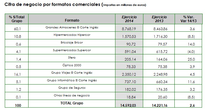 Por líneas de actividad, las tres con mayor aportación al consolidado son los grandes almacenes, los hipermercados y la agencia de viajes, que suman el 87% del total de la cifra de negocios.