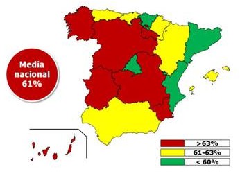 Por CCAA, Extremadura (67%), encabeza el ranking con casi seis puntos por encima de la media nacional. Le siguen Castilla y León (66%) y Canarias (65%). En el otro extremo se encuentra Madrid (53%), País Vasco (59%) y Cataluña (60%).