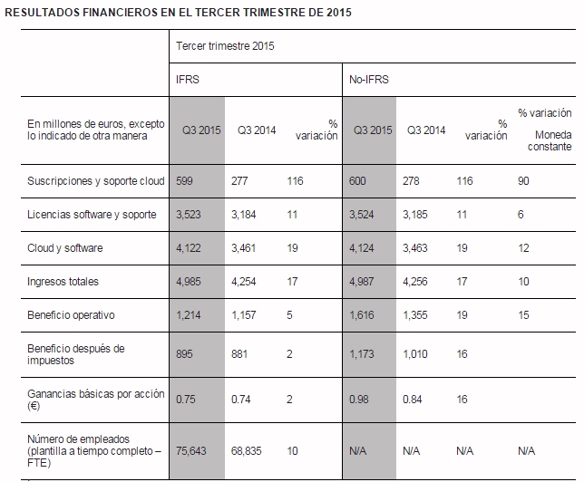La compañía espera que en 2015 los ingresos cloud y software no IFRS se incrementen entre un 8% y un 10% en moneda constante (2014: 14.330 millones de euros).
