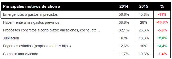 Como ocurrió en 2014, este año el principal motivo para ahorrar sigue siendo hacer frente a gastos imprevistos, seguido a continuación de los gastos previstos. No obstante, ambas partidas han descendido considerablemente respecto al año pasado. Por el contrario, las únicas partidas que este año aumentan son el ahorro para la jubilación y los estudios.