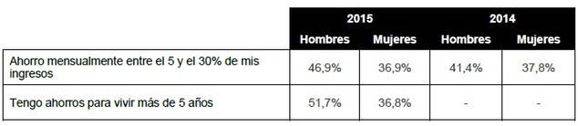 La brecha entre hombres y mujeres se hace más grandeA pesar de estos datos positivos respecto a la capacidad de ahorro, cabe destacar el aumento de desigualdad entre hombres y mujeres a este respecto en el último año. En cuestión de género, la diferencia de porcentaje de las personas que ahorran cada mes entre el 5 y 30% de sus ingresos es de diez puntos, cuando en 2014 esta diferencia era de 3 puntos. Por su parte, existe una diferencia de casi 15 puntos entre hombres y mujeres que afirman que pueden vivir más de cinco años con sus ahorros.