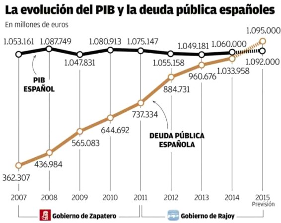 El Producto Interior Bruto (PIB) español fue de 1.031.000 millones de euros en 2013 y se prevé que en 2015 llegue a 1.083.000 millones. Asimismo tenemos una deuda pública que en 2013 era de 966.000 millones de euros y que en 2015 se prevé alcance la cifra de 1.079.700 millones, es decir el 99,7% del PIB. Por otra parte los Presupuestos Generales del Estado (PGE) consolidados fueron de 408.033 millones en 2013 y de 440.074 millones en 2015, lo que equivale a un 39,6% del PIB en 2013 y a un 40,6% en 2015. Conviene señalar que estos porcentajes no reflejan el impacto del gasto público total en la economía ya que además hay que añadir los gastos que las CC.AA y Entes locales financian con recursos propios (básicamente impuestos cedidos) lo que eleva la cifra del gasto público total a un 57% del PIB en 2015, según señala el experto Lorenzo Alonso.