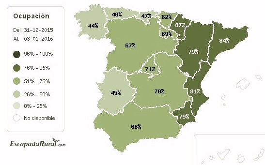 Escapadarural.com, el portal especializado en turismo rural que reúne la mayor oferta nacional de alojamientos (90% del total), presenta las cifras de ocupación para la última noche del año. Según la información analizada hasta el momento, basada en un total de 5.992 calendarios de reserva, la media nacional para la última noche del año se sitúa en el 73%, superando los datos de 2014. Sin embargo, al tener en cuenta las noches del 1 y 2 de enero, esta cifra desciende hasta el 65%.