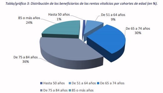 Un análisis por tramos de edad de las rentas vitalicias colectivas evidencia que se trata de un producto para la jubilación. El 90% de los beneficiarios son personas de más de 65 años. De hecho, la cohorte de perceptores más nutrida es la de las personas entre 75 y 84 años. La edad media de los beneficiarios en muy parecida en todas las regiones. Por lo general, oscila entre los 74 y los 79 años. La muestra recabada por UNESPA revela un sesgo en las rentas vitalicias en favor de los hombres. El 63% de los perceptores son varones, frente al 37% restante de mujeres. Este hecho se debe a la composición y características del mercado laboral español hace dos décadas. A pesar de ello, la mayor longevidad de ellas hace que, sobrepasados los 85 años, el 50% de las perceptoras de rentas vitalicias sean mujeres y que su peso supere al de los hombres a partir de dicha edad.