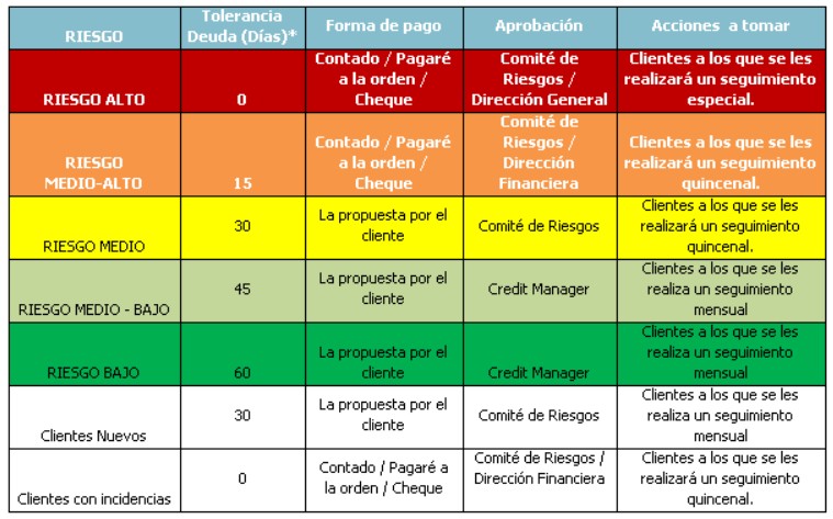 Este es el primer paso de cara a establecer una política de gestión de riesgos, luego tendríamos que calcular el límite de riesgo por categoría y definir el procedimiento a seguir. Por ejemplo, la tolerancia en cuanto a la fecha de pago, la forma de pago, si necesita avales o garantías, etc.