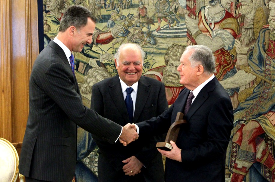 De izquierda a derecha, S.M. El Rey D. Felipe VI, el presidente del jurado y presidente de Honor del CEAL Ibérico, el Sr. Enrique V. Iglesias y el ganador del II Premio Enrique V. Iglesias, el Sr. Luis Carlos Sarmiento Angulo. (Foto © Casa de S.M. el Rey).-